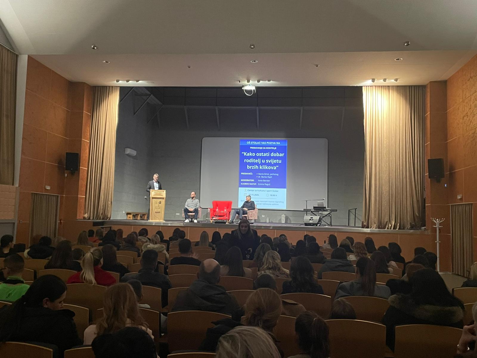 Osnovna škola Stolac je u četvrtak, 27. studenog 2025. god., organizirala predavanje za roditelje koje je prethodno planirano po Godišnjem planu i programu škole. Tema predavanja bila je „Kako ostati dobar roditelj u svijetu brzih klikova“. Naši predavači bili su g. Mario Brkić, psiholog s dugogodišnjim iskustvom rada u školi, dr. Borko Rajič te g. Ante Bender, u ulozi moderatora. Zajednički cilj škole i roditelja je odgajati djecu koja će rasti sigurno, samouvjereno i odgovorno u svijetu koji se mijenja brže nego ikada. Važnost ove tematike prepoznali su brojni roditelji i naši sugrađani koji su u velikom broju došli na predavanje.