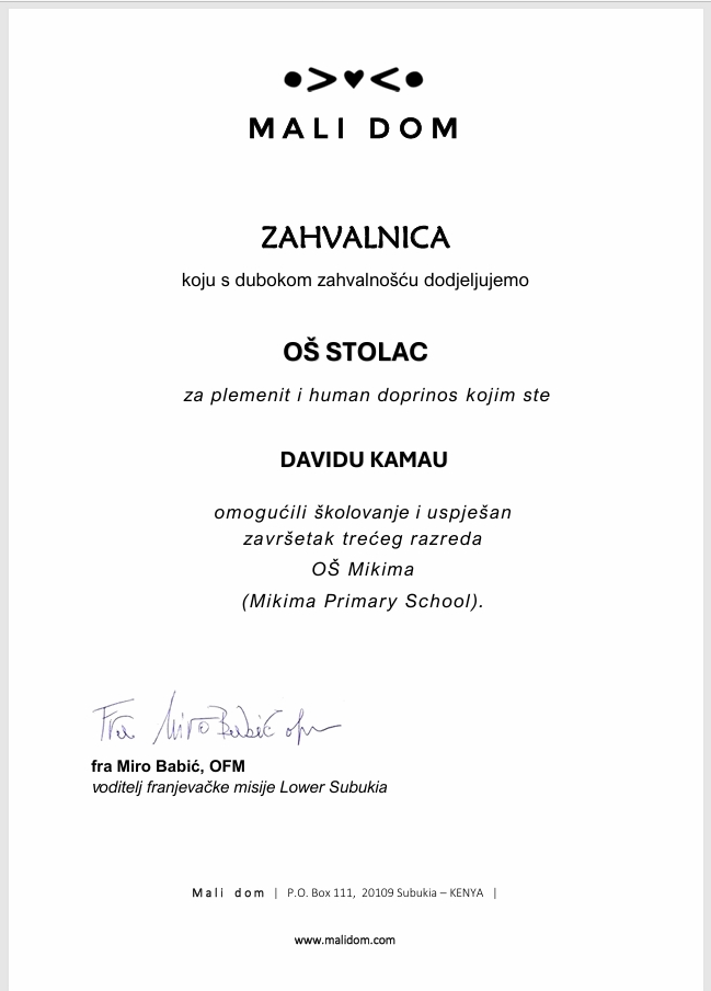 Na adresu naše škole stigla je i zahvalnica iz sirotišta Mali dom u Keniji, kojom voditelj misije fra Miro Babić izražava duboku zahvalnost našoj školi za pruženu pomoć i podršku Davidu u njegovom školovanju.